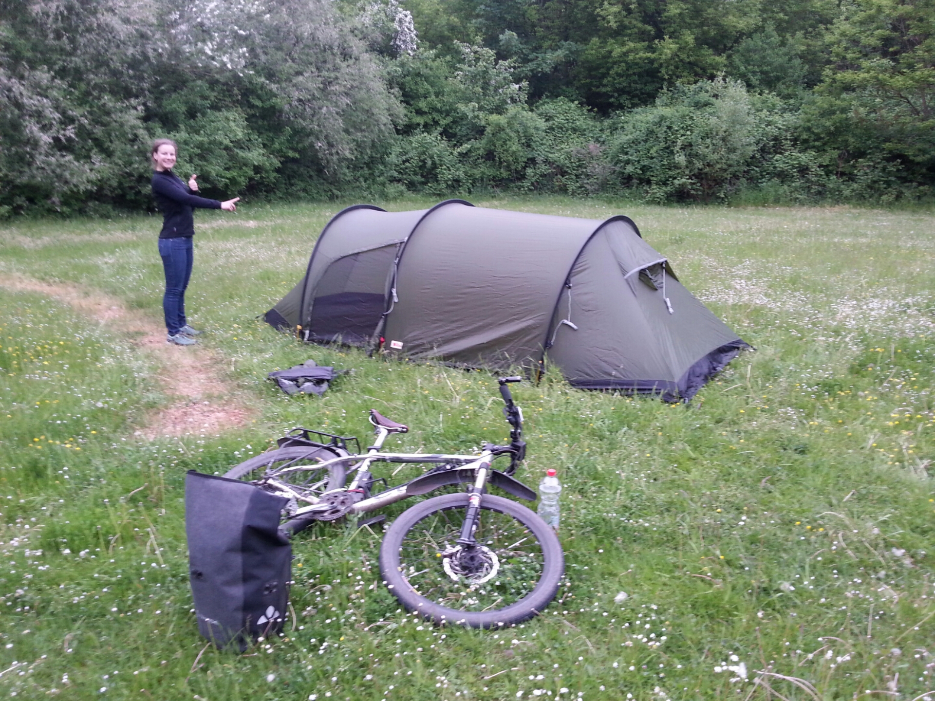 Unvermittelt machen wir uns nach der Arbeit im nahegelegenen Park daran, unser neues Heim aufzustellen. Und das ging schneller, als gedacht. Am längsten hat es eigentlich gedauert, den separaten Zeltboden am Zelt einzuhängen. Der Boden soll nun aber auch erstmal am Zelt bleiben, weshalb sich dieser Vorgang hoffentlich nicht all zu oft wiederholt. Und dann: 3 Stangen rein, 4 Heringe und schon steht das Teil in Prinzip. Die Abspannerei haben wir uns erstmal geklemmt, da wir ja nur mal gucken wollten 🙂