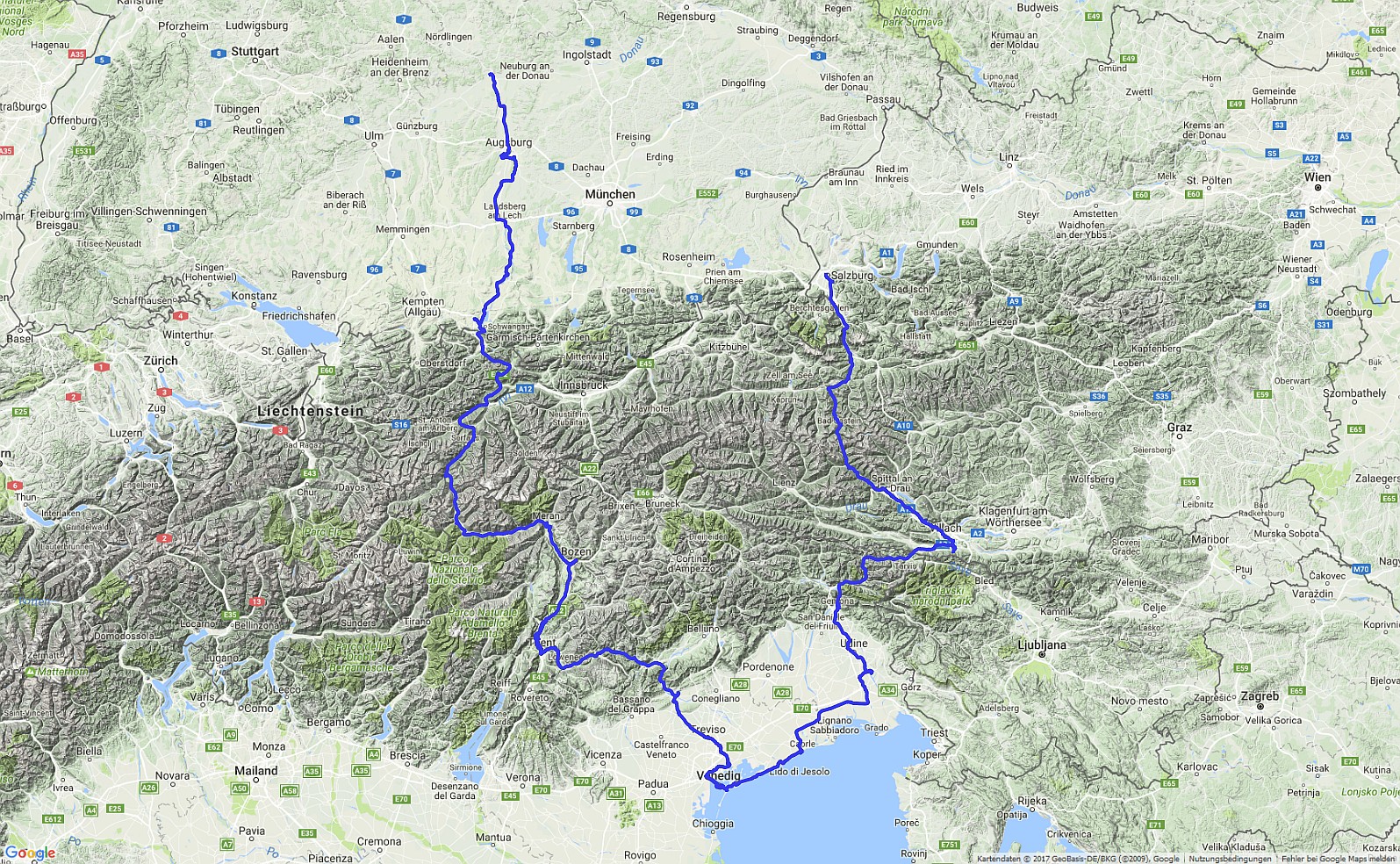 Donauwörth – Augsburg – Landsberg am Lech – Füssen – Ried am Inn – Meran – Bozen – Trient – Mestre – Venedig – Caorle – Manzano – Gemona – Faak am See – Obervellach – Tauernschleuse – Bad Gastein – Salzburg