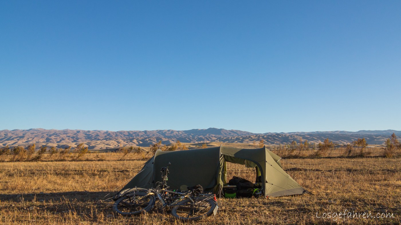 Was wir alles mit dem Zelt veranstaltet haben, könnt ihr euch unter Fernreise Zentralasien  nochmal anschauen. Insgesamt waren es um die 100 Nächte im Zelt, entsprechend oft wurde das Zelt auf- und abgebaut, gezeltet wurde überall – wobei die grüne Wiese tatsächlich am wenigsten vertreten war. Mit folgender Ausstattung sind wir unterwegs gewesen: