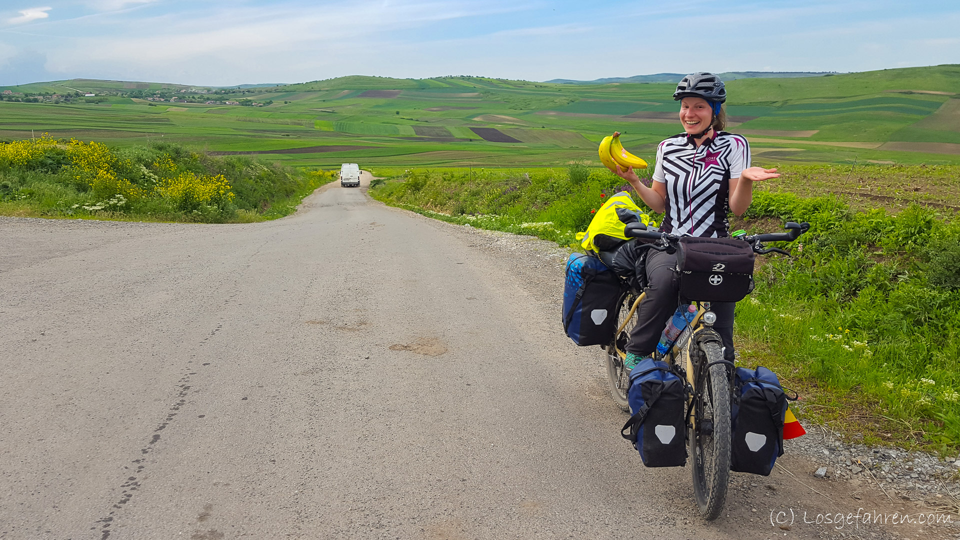 Wir gucken nach dem Weg. Ein Transporter hält an. Der Fahrer steigt aus, läuft um sein Auto und holt aus seinem Auto ein Bündel Bananen. Mit den Worten „have a nice holiday“ drückt er diese uns in die Hand und ist genau so schnell verschwunden, wie er kam…